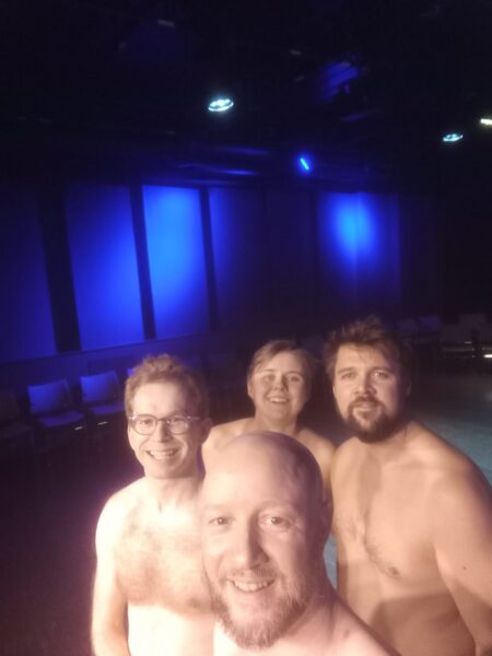 Det var plass til 70 tilskuere i salen som ble brukt, og forestillingen var utsolgt. Blant publikum var det mange organiserte naturister, men også flere som ikke hadde noen tilknytning til naturistmiljøet. Det var spesielt hyggelig å se at mange fra folkemusikk- og folkedansmiljøet hadde møtt opp denne kvelden. Jeg antar at noen av dem hadde tatt steget ut av sin komfortsone og kastet klærne for anledningen – noe jeg synes er modig gjort. Et par av dem som prøvde naturisme for første gang fortalte at øyeblikket da de kledde av seg var litt skummelt, men at følelsen raskt gikk over. Så snart de sto nakne, opplevde de sin egen nakenhet som helt naturlig – alle andre var jo også nakne.