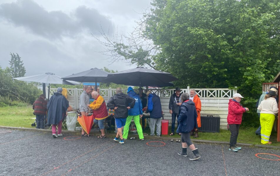 Ragnvald – sjef for Petanquegruppen på Sjøhaug naturistsenter – var allerede i 8-tiden ute og raket banene og erklærte 7 av 8 baner som spilleklare til tross for all nedbøren som var kommet.