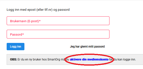 Gå til portal.smartorg.no/login og trykk på «Aktiver din medlemskonto».